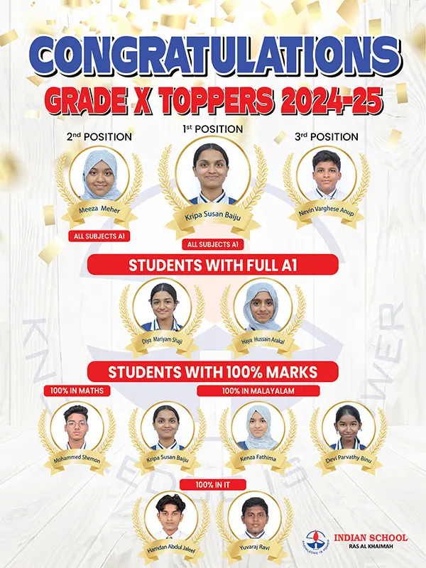 At Indian School Ras Al Khaimah, we take pride in the outstanding achievements of our students, both in academics and beyond. From excelling in examinations and competitions to showcasing talent in sports, arts, and cultural activities, our students consistently demonstrate excellence, creativity, and determination. These accomplishments reflect the holistic education we provide and our commitment to nurturing well-rounded individuals ready to succeed in every field of life.